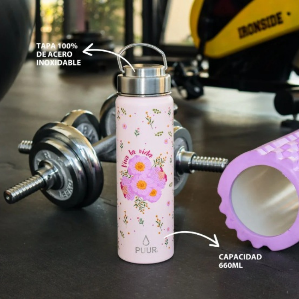 Fabricada en triple pared de acero inoxidable y una de cobre en su interior, esta botella garantiza que tus bebidas se mantengan frías durante 24 horas y calientes por 12 horas.