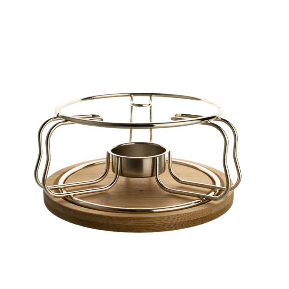 Soporte de acero inoxidable con base de bambú para una vela tipo Tea light para mantener las preparaciones de té calientes. Diseño práctico, que se adapta a todas las teteras. Sólo necesitas preparar tu té o infusión, prender la vela y situar la tetera sobre la superficie.