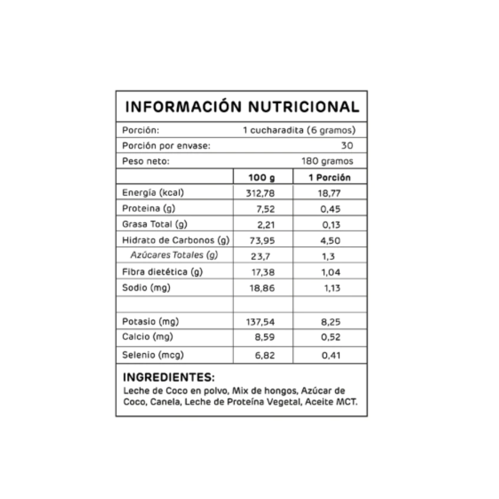 Ingredientes: Leche de coco en polvo, Mix de hongos. Azúcar de coco, Canela, Leche de Proteína Vegetal, Aceite MCT.