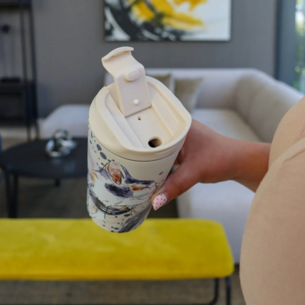 El Mug Cat Sand 470 ml encanta con su ilustración artística de gato sobre un fondo arena, combinando ternura y estilo en un diseño único que mantiene tus bebidas a la temperatura ideal.