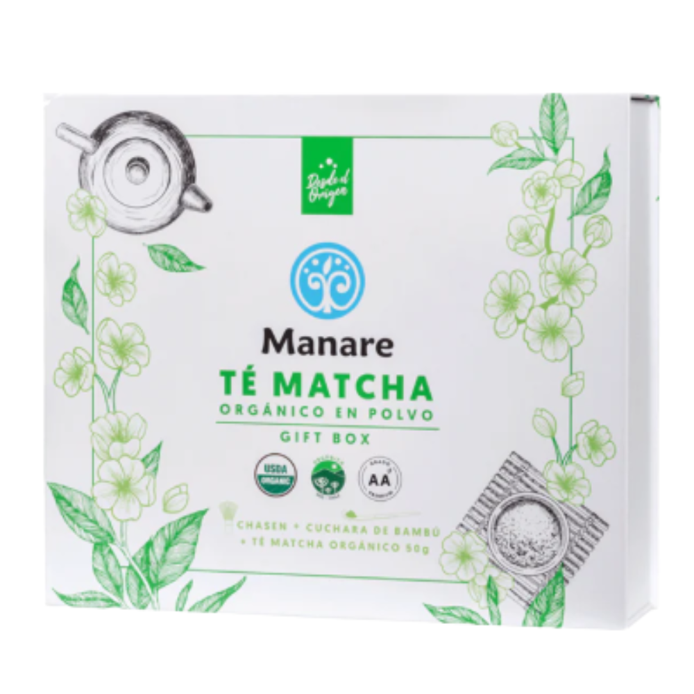 Formato: Gift Box de Manare que incluye: Té Matcha 50gr, Chasen y cuchara de Bambú.