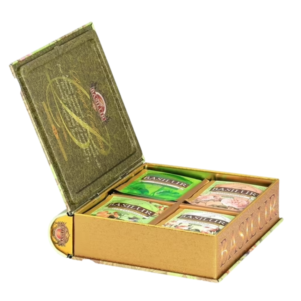 Formato: Libro metálico Bouquet Basilur con 32 bolsitas de 4 diferentes variedades.