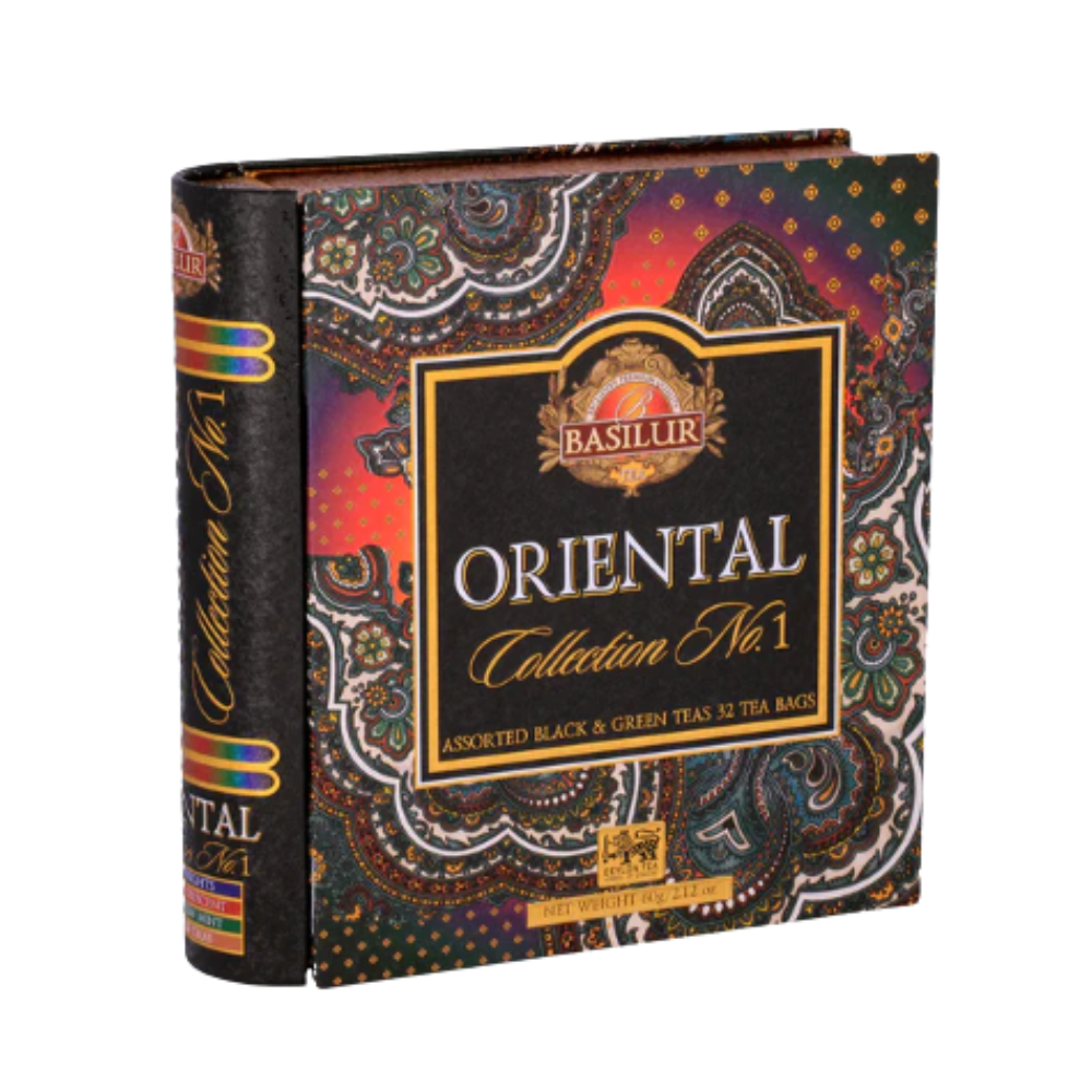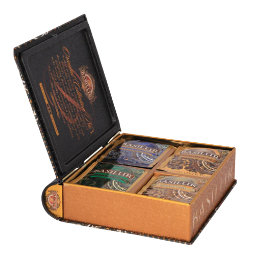 Formato: Libro metálico Oriental Collection N° 1 Basilur con 32 bolsitas de 4 variedades diferentes.