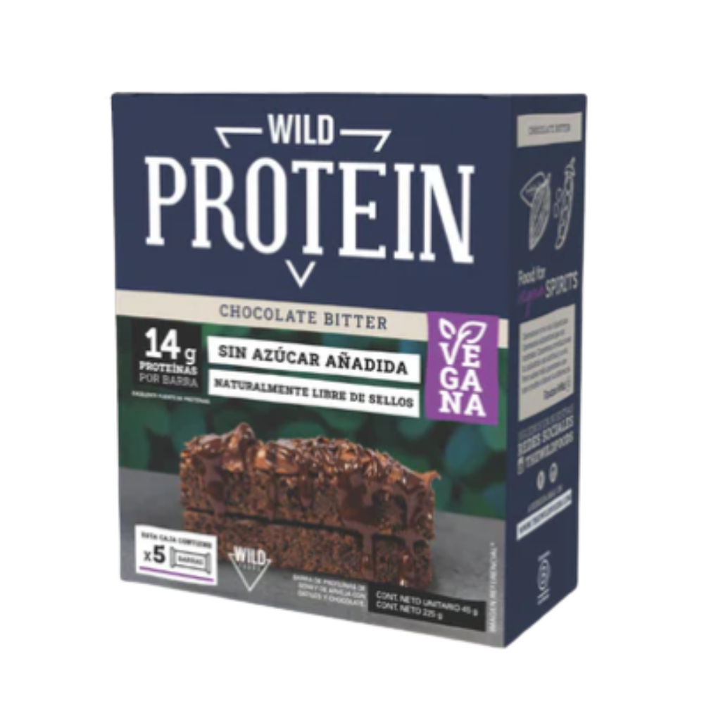 Formato: Caja 5 unidades, 45 gr.c/u. Wild Protein Vegana Chocolate Bitter contiene crispines de proteína de soya, proteína aislada de arvejas, maní, chocolate, coco endulzado con dátiles.