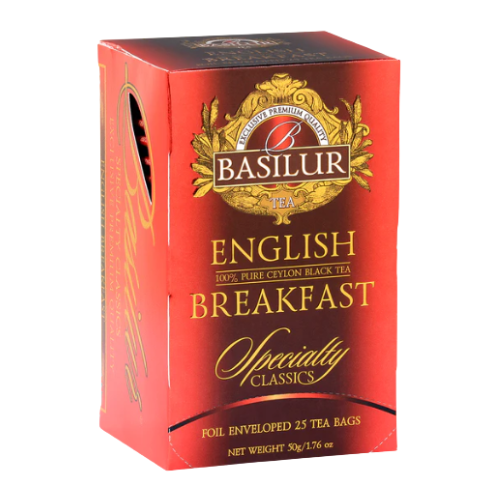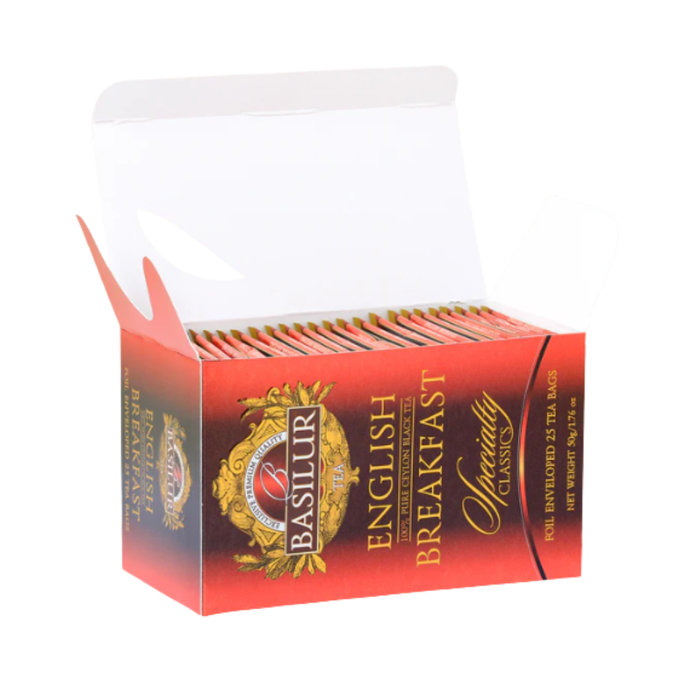 El té Basilur English Breakfast, es una tradición que se mantiene viva para rememorar la deliciosa comida inglesa y la gloriosa época victoriana. El Desayuno Inglés, elaborado con té puro de Ceilán, celebra el encanto inglés y el sabor histórico de los mejores tés del mundo.