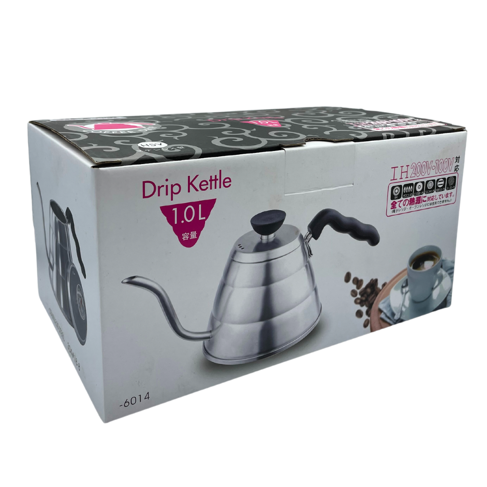 Tetera de acero inoxidable con boquilla que permite controlar con precisión el flujo del agua hacia el filtrado en la preparación del café.
