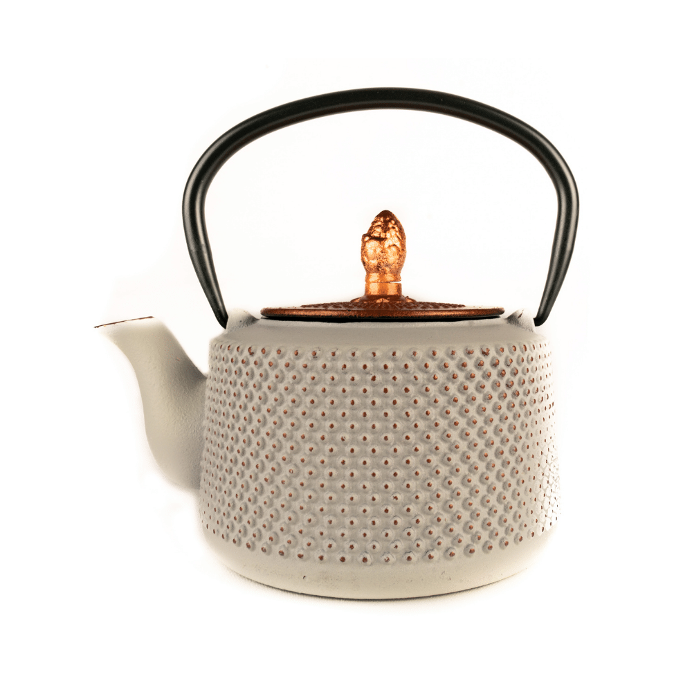 Tetera de Hierro, enlozada en su interior, incluye colador. Color blanco, con tapa y detalles color cobre.