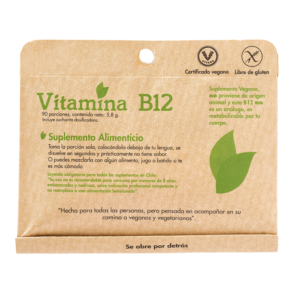 Esta vitamina B12 es un preparado en polvo y tiene solo dos ingredientes: vitamina B12 y calcio para protegerla y que la puedas dosificar, no hay ningún aditivo. Ambos ingredientes NO provienen de origen animal. El calcio es de origen mineral, extraído de las rocas, y la vitamina B12 es creada en laboratorio por fermentación de bacterias, y luego se estabiliza formando la cianocobalamina, que es una de las formas más comunes de B12, la cual puede ser metabolizada por tu cuerpo.